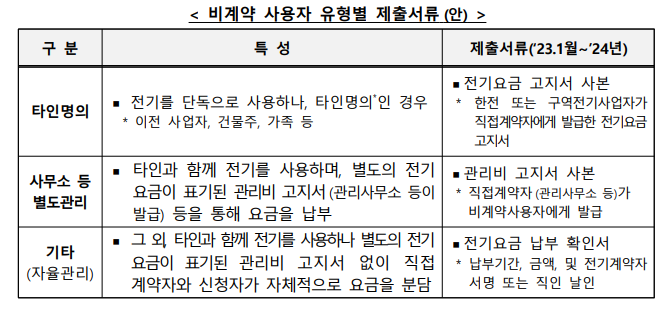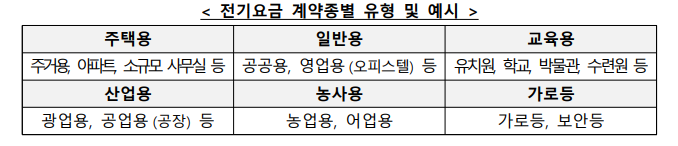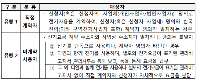 - 사용하는 전기요금 계약이 일반용, 산업용, 농사용, 교육용, 주택용 및 비주거용 요금을 부담하는 사업자여야 합니다.