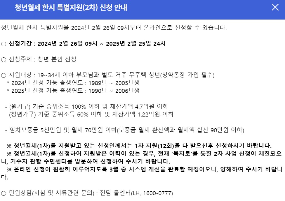 - 온라인 : 복지로 로그인 → 서비스 신청 → 복지서비스 신청 → 복지급여 신청 → 기타 → 청년월세 한시 특별지원 경로로신청가능합니다